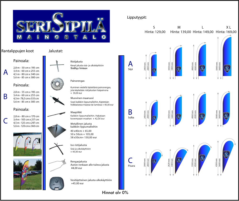 sisätiloihin kuin myös ulkoilmakäyttöön. Kaikkiin malleihin voi tilata myös pelkän lipun, jos kuva-aiheesi vaihtuu tai haluat käyttää Beach Flagia