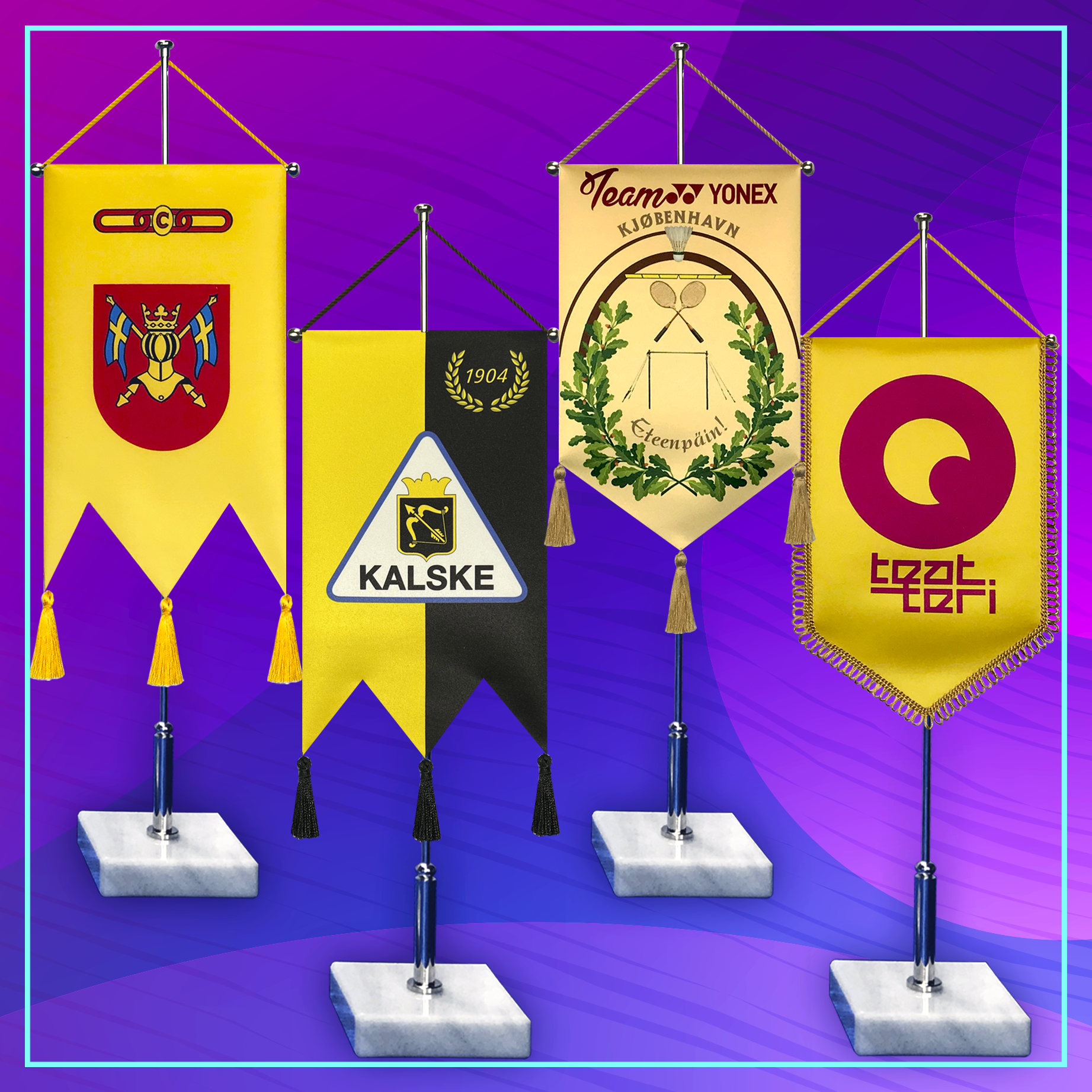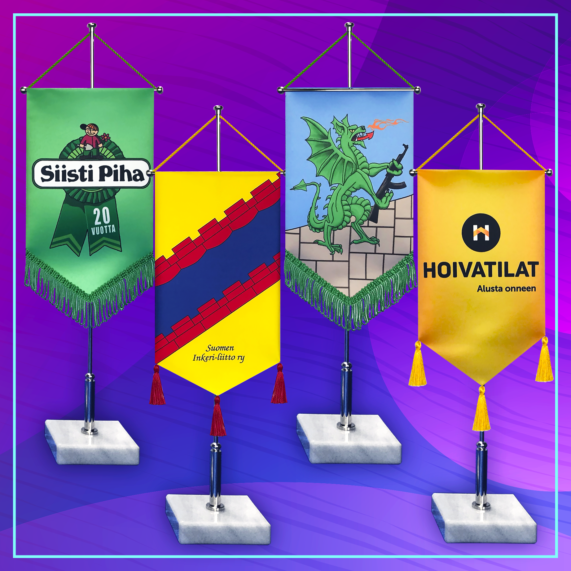 Valmistamamme pöytäviirit eli standaarit ovat pöydällä pidettäviä poikkitangossa roikkuvia, kolminkertaisesta laadukkaasta satiinikankaasta valmistettuja viirejä, joihin on painettu yhteisön tunnus.
